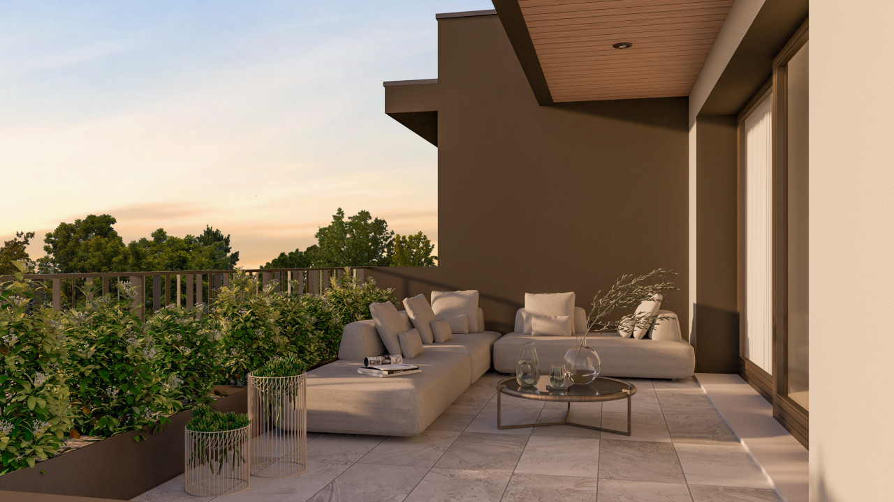 Al piano terra, giardini privati che profumano di libertà e relax; ai piani superiori, ampie terrazze abitabili dove godersi il sole, la vista e il silenzio.